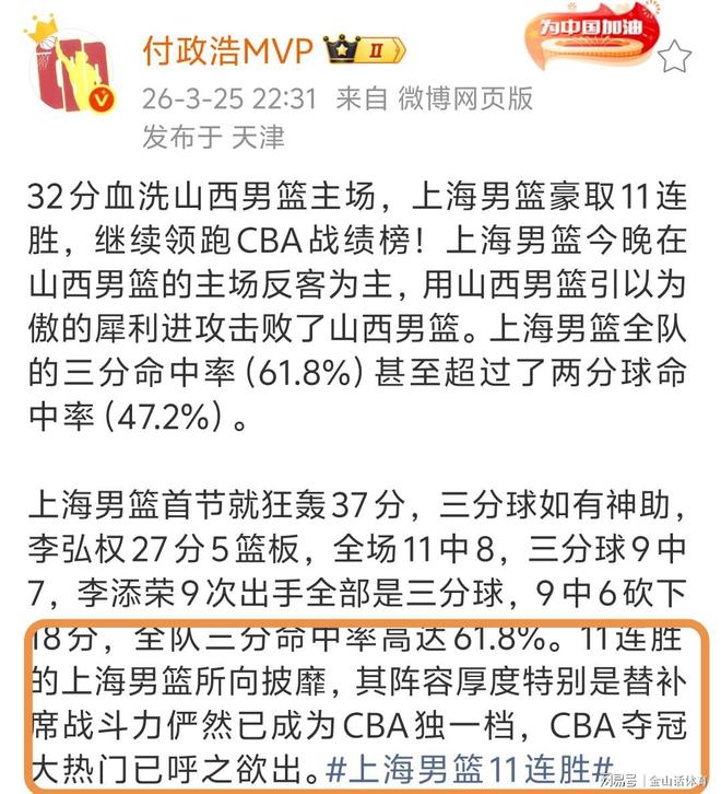 上海男篮如今如日中天的状态,高歌猛进的强劲表现,也令众多媒体人感到惊叹。上海大胜山西当晚,著名媒体人付政浩在个人社媒发文表示“32分血洗山西男篮主场,上海男篮豪取11连胜,继续领跑CBA战绩榜……11连胜的上海男篮所向披靡,其阵容厚度特别是替补席战斗力,俨然已成为CBA独一档,CBA夺冠大热门已呼之欲出。”。付政浩不惜誉美之词,就差说“上海队的冠军稳了”……